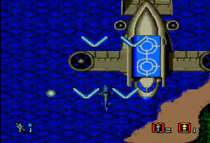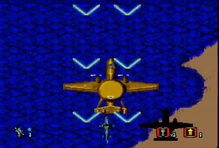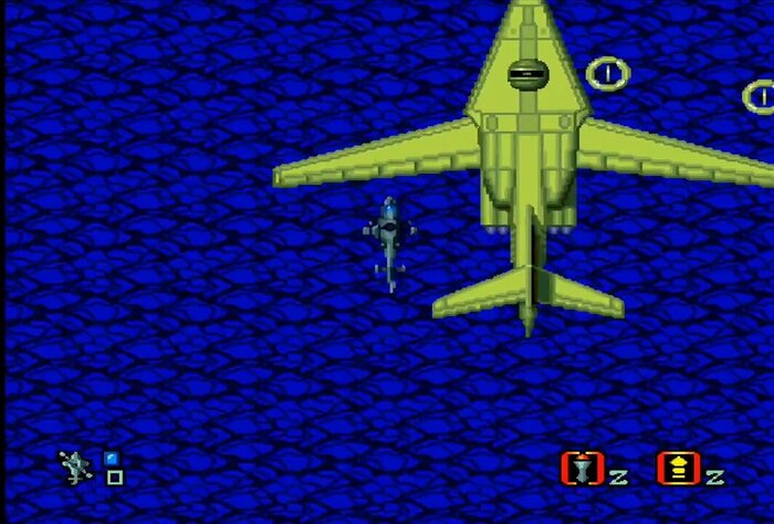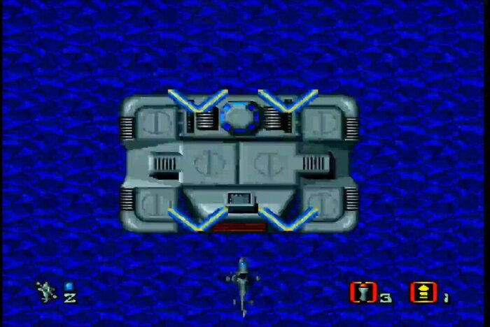 Боевой авианосец, оснащенный боевыми вертолетами. Авианосец ведёт огонь с помощью двух пушек, попеременно стреляя влево и вправо + ему помогают два вертолета. В первую очередь нужно уничтожить две пушки, на корме самолёта. Самый лёгкий способ уничтожить пушки, это дождаться когда авианосец улетит с экрана, и в момент возвращения самолёта на экран, начинать огонь по пушкам, пока самолёт находится на достаточном расстоянии от игрока. Если с первого захода уничтожить пушки не удалось, лучше отлететь в сторону, уничтожить два вражеских вертолета, и дождаться когда авианосец вновь скроется с экрана, и начнет возвращаться снова, повторить огонь по пушкам.