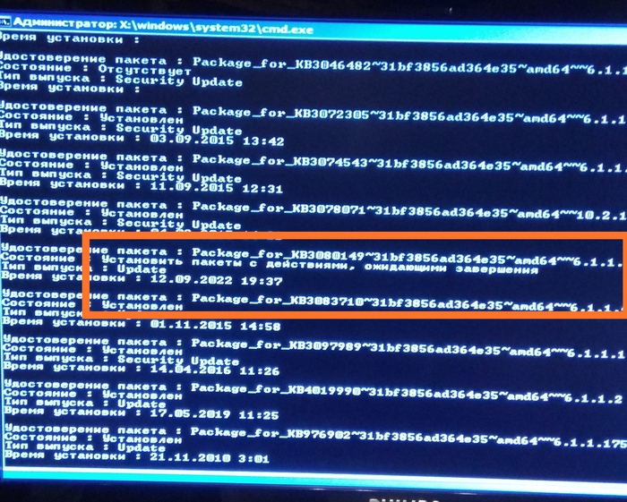 Нагуглил, как можно удалить обновления винды через командную строку с помощью DISM, но столкнулся с проблемой, что это самое обновление не установилось до конца, а "ожидает завершения".