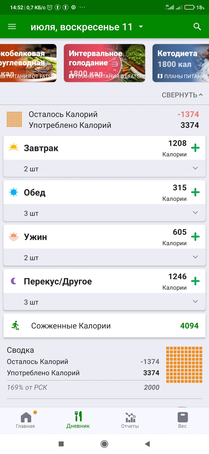 5. Нашел в приложении расчёт потраченных и приобретённых ккал, за две недели ни разу не превышал лимит потраченных - съеденым.