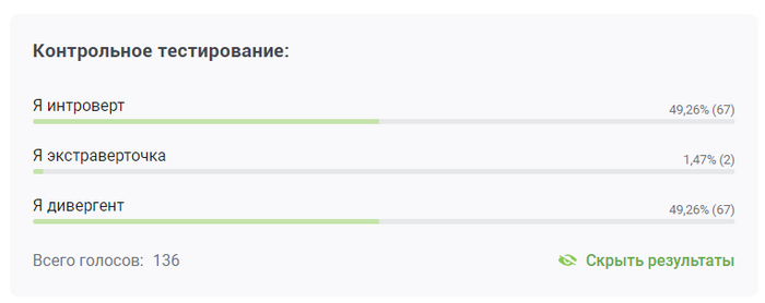Можно сделать вывод, что одинокий типичный пикобянин скорее встретит здесь дивергента, чем экстраверточку. Такие дела.