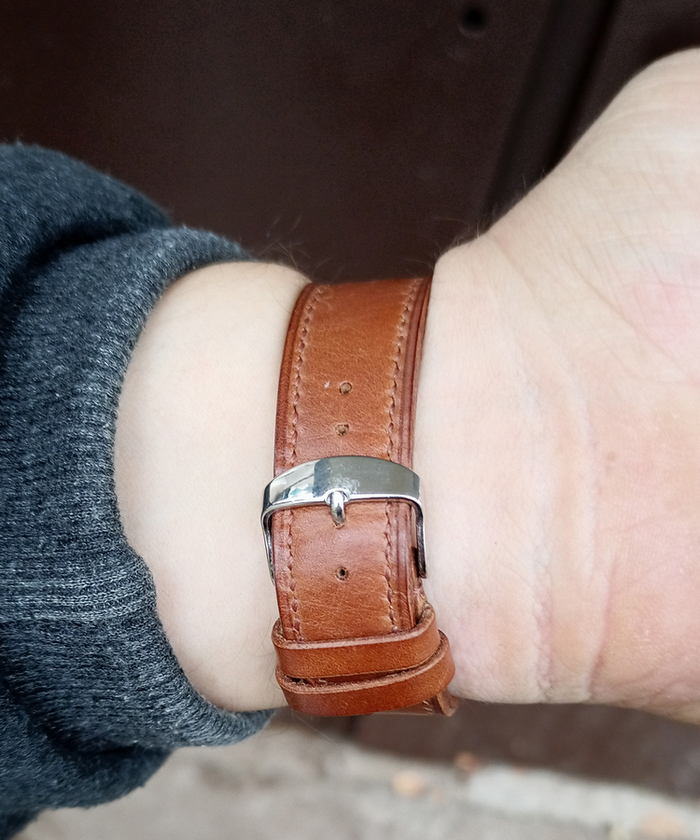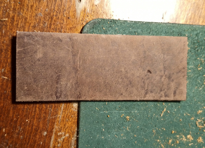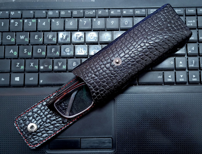 Промерял очки, подобрал выкройку, пару кусков кожи. Сверху будет кожа толщиной 1,5 мм., неизвестного происхождения с лоскутных развалов, а снизу, для комфортного нахождения оптического прибора, расположится подклад из свинки, толщиной 1 мм. Нить "Galases", 0.55 мм. Шаг пробойника 4 мм.