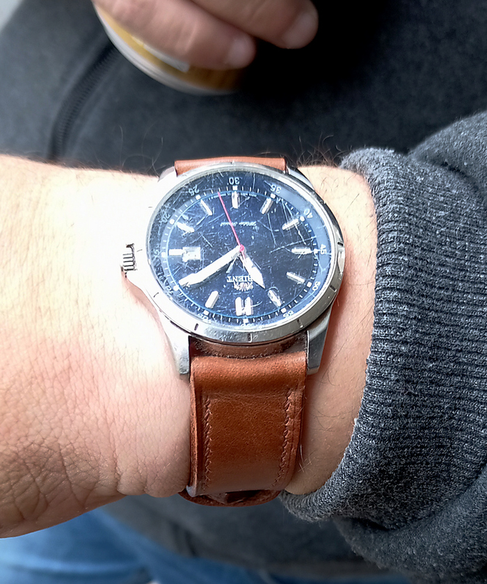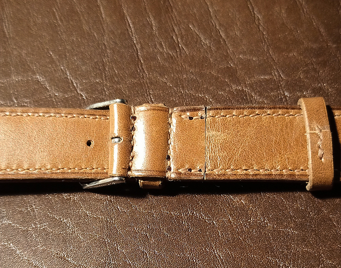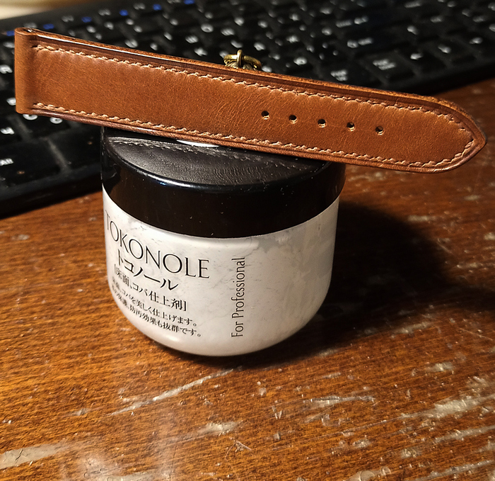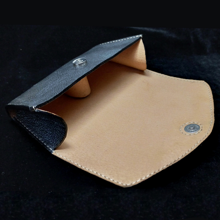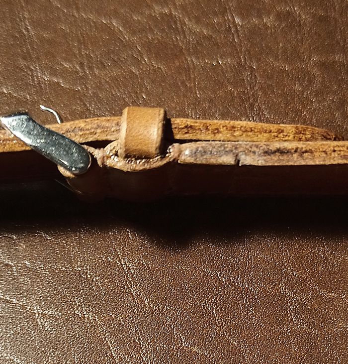 Кнопка, торчащая наружу, мне не нравится, буду прятать под утяжелитель клапана. В футляре кнопку закрою накладкой из кожи. Сейчас, с появлением двоилки, проблем с подготовкой полос кожи минимальной толщины для подобных задач, вообще не стало, делается легким движением руки. Верх кнопки, соответственно, предварительно сплющил.