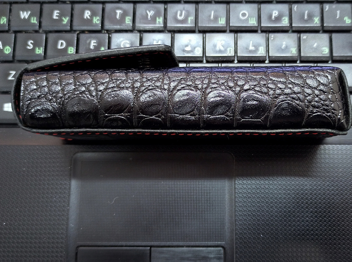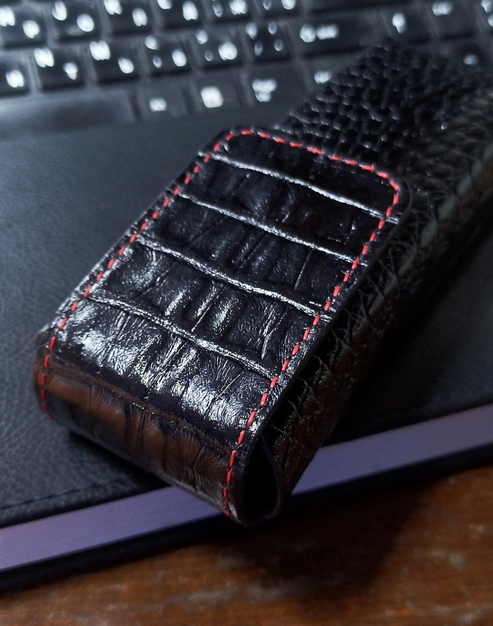 Снял размеры, нашел кусок почти настоящего крокодила, нарисовал выкройку прямо на коже, вырезал.