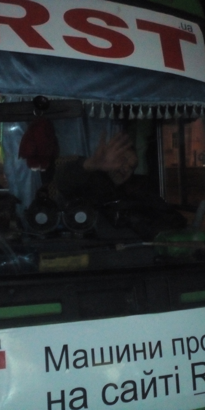 Заходим в маршрутку, справа от водителя сидит яжемать, которая собирает деньги у входящих (без чеков, билетов итп. Просто тупо собирает деньги!), утверждает, что водителю тоже нужно отдыхать. (Уснувшему, блять, водителю на маршруте нужно отдыхать!!!(после гугла - интервал остановки 10 минут)) Возникает словесная перепалка децибел на 120,(с хабалкой), водитель все равно спит. Тобишь, ему просто пофиг на происходящее. Дабы не нарушать закон, обходим маршрутку, слегка ладонью по лобовому - и вот он наш герой.