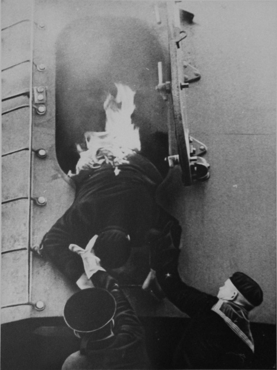 Матросы крейсера «Красный Кавказ» достают горящего башенного комендора краснофлотца Василия Матвеевича Покутного (год рождения-1916).