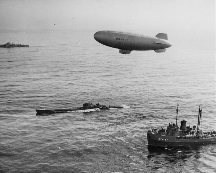 Капитулировавшая подводная лодка кригсмарине U-858 (тип IX-C/40) в окрестностях мыса Мэй. На переднем плане американский спасательный буксир USS ATR-57. На заднем плане американский эскортный эсминец «Поуп» (USS Pope, DE-134). В кадре дирижабль ВМФ США.