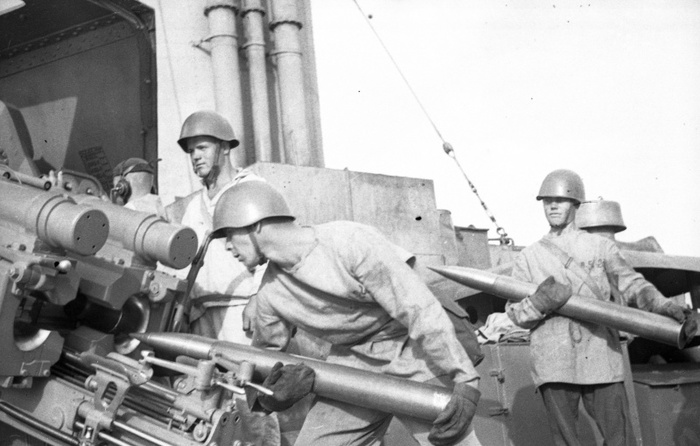 Моряки-артиллеристы крейсера Черноморского флота проекта 815 «Красный Кавказ» (до 14 декабря 1926 года — «Адмирал Лазарев») заряжают 100-мм двухорудийную спаренную морскую зенитную установку системы «Минизини». Заряжающий - краснофлотец Александр Павлович Паригин (Парыгин) (1919 г.р.).