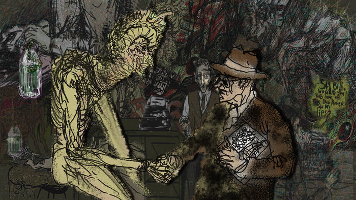 Старый Китаец зачерпывает речной воды в ржавую консервную банку и промывает сифилис тяги, плотный и черный как шлак. (Примечание: Сифилис тяги – это пепел скуренного опия.)