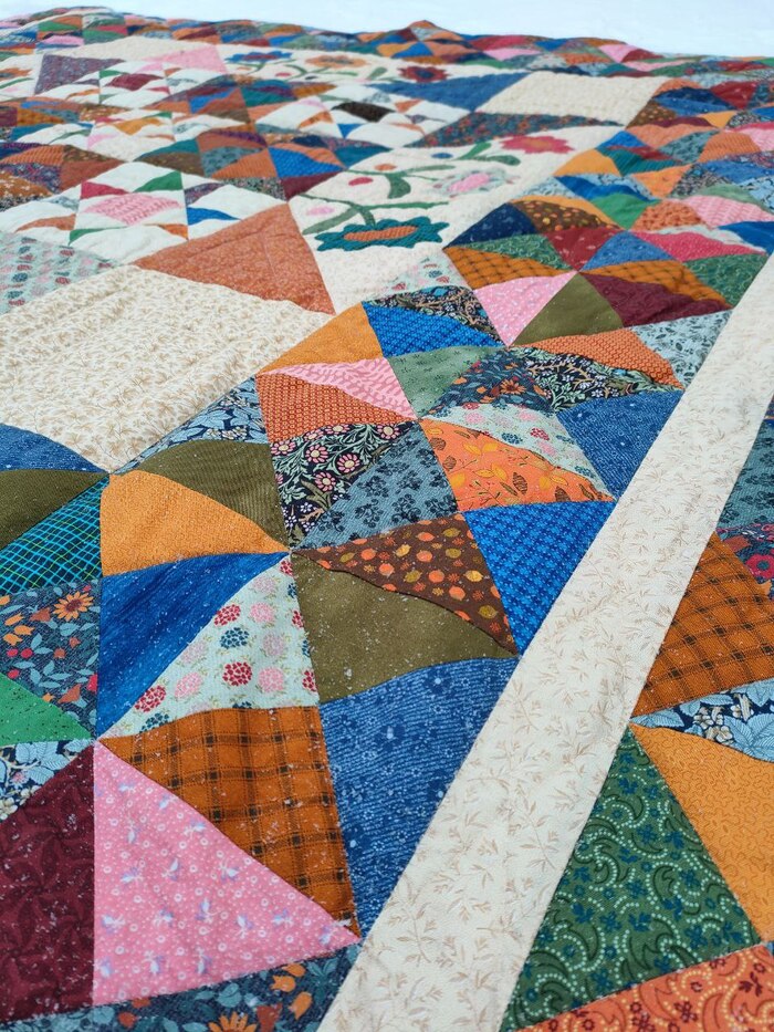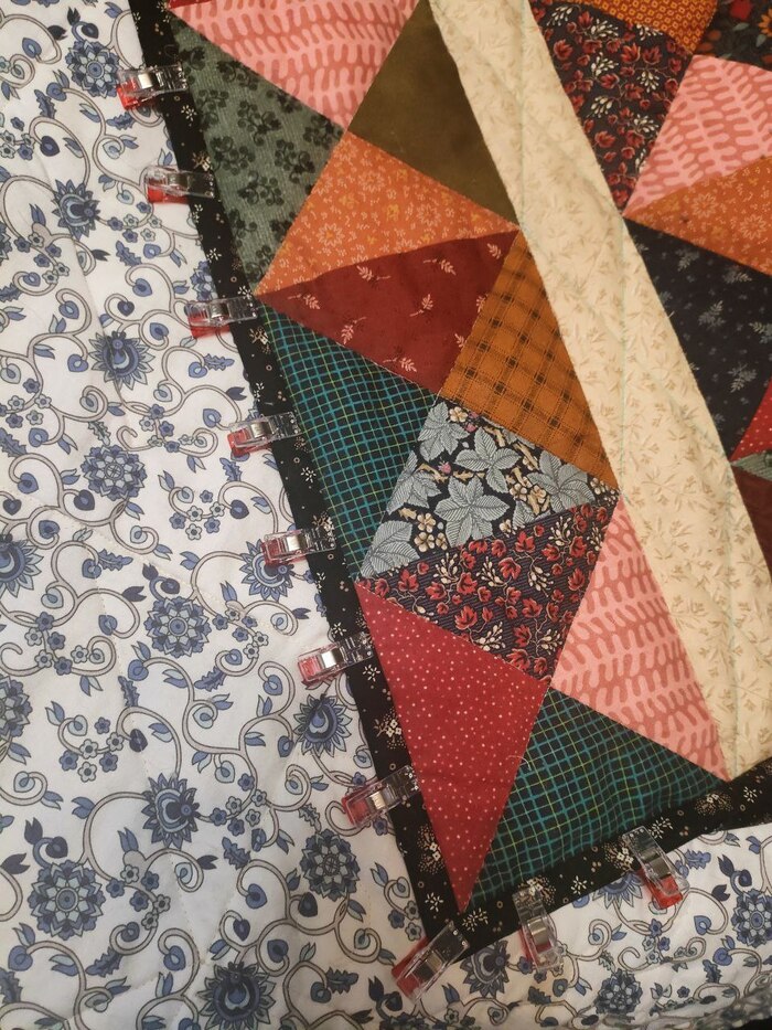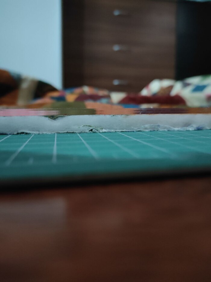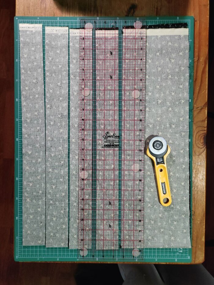 После стежки готовим квилт к окантовке. Обрезаем края, кроим окантовку: