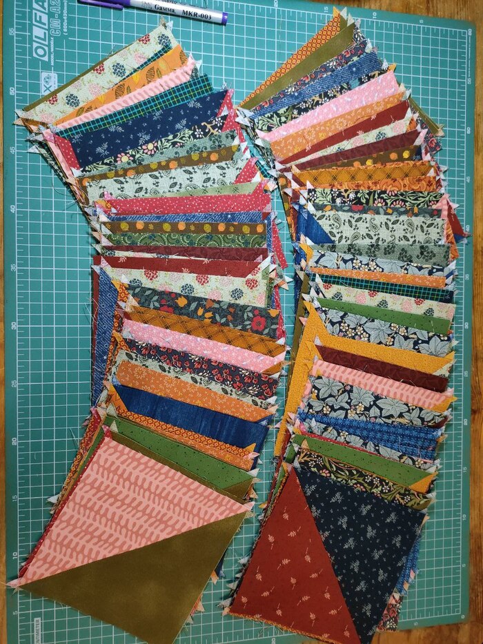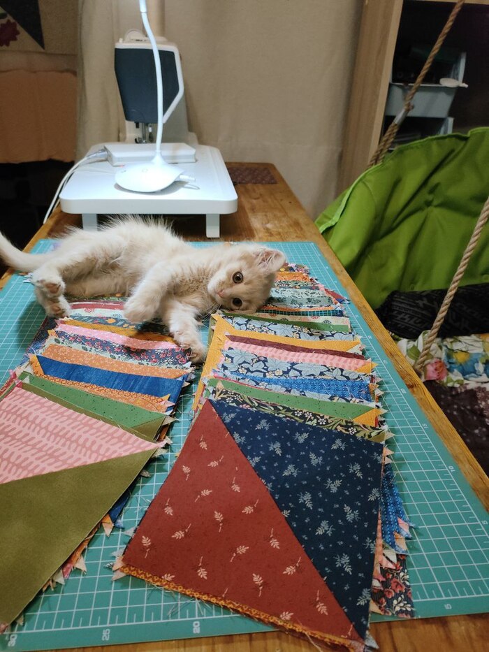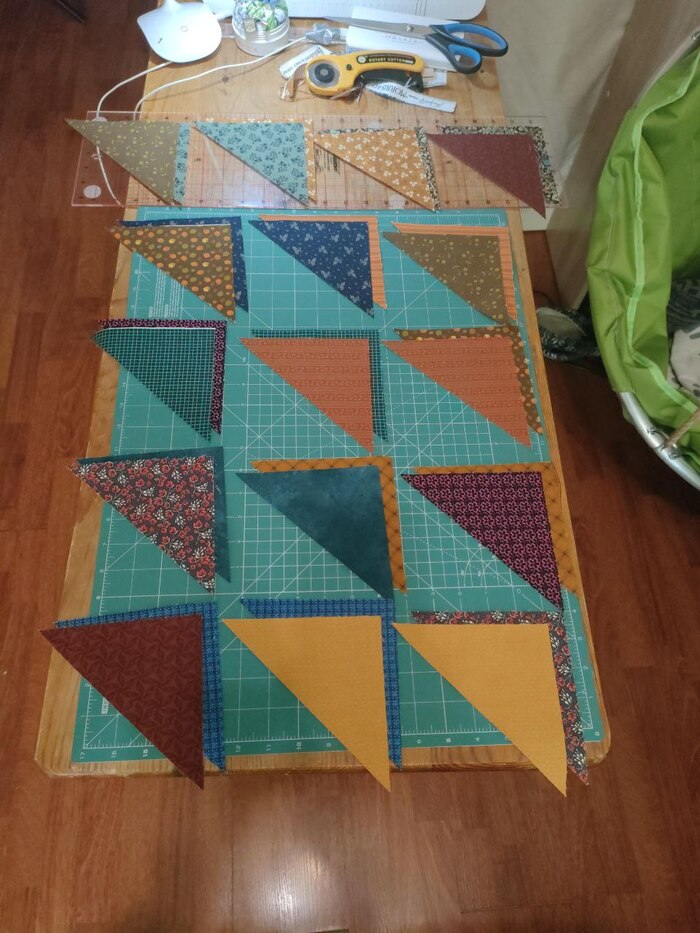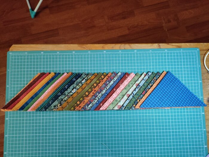 Теперь сшиваем по два квадрата с разными цветами и разрезаем по диагонали (вот этот момент я как-то профукала, увлеклась и не сфотографировала, 1000 сорри и скузи)