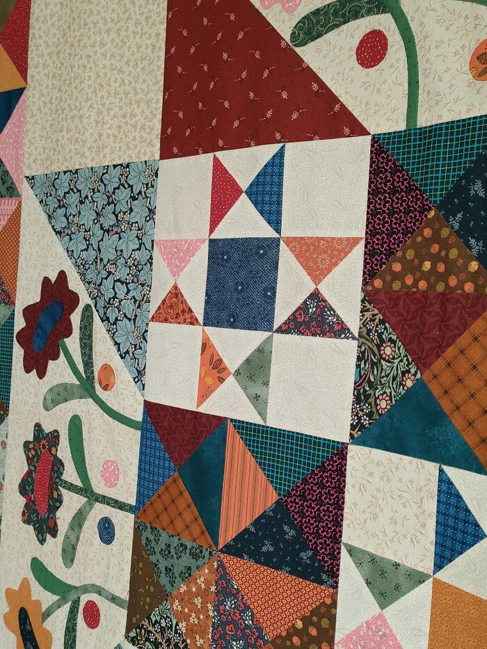 И вот, ура, все готово. Сбоку на ткань с аппликацией пришила цветные углы, тоже разного цвета. И вот окончательно готовые детали квилта с ручной аппликацией.