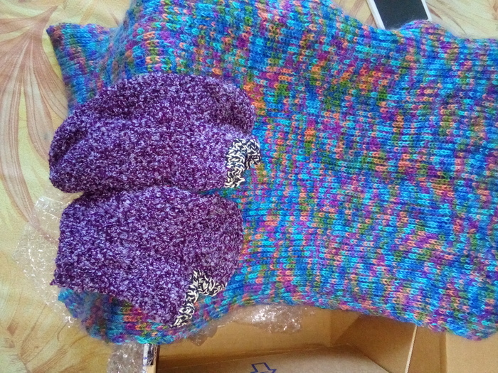 Дальше-круче: носочки ручной работы,и теплый шерстяной снуд из меланжевой пряжи,тоже ручной работы. Я понятия не имею,как VizirOk так угадала-снуд я хотела давно, но попадался то слишком маленький,то слишком длинный,то стоит как крыло боинга,в общем снудовые звезды все никак не сходились. А тут ррраз-и такой шикарный!Огромное спасибо!
