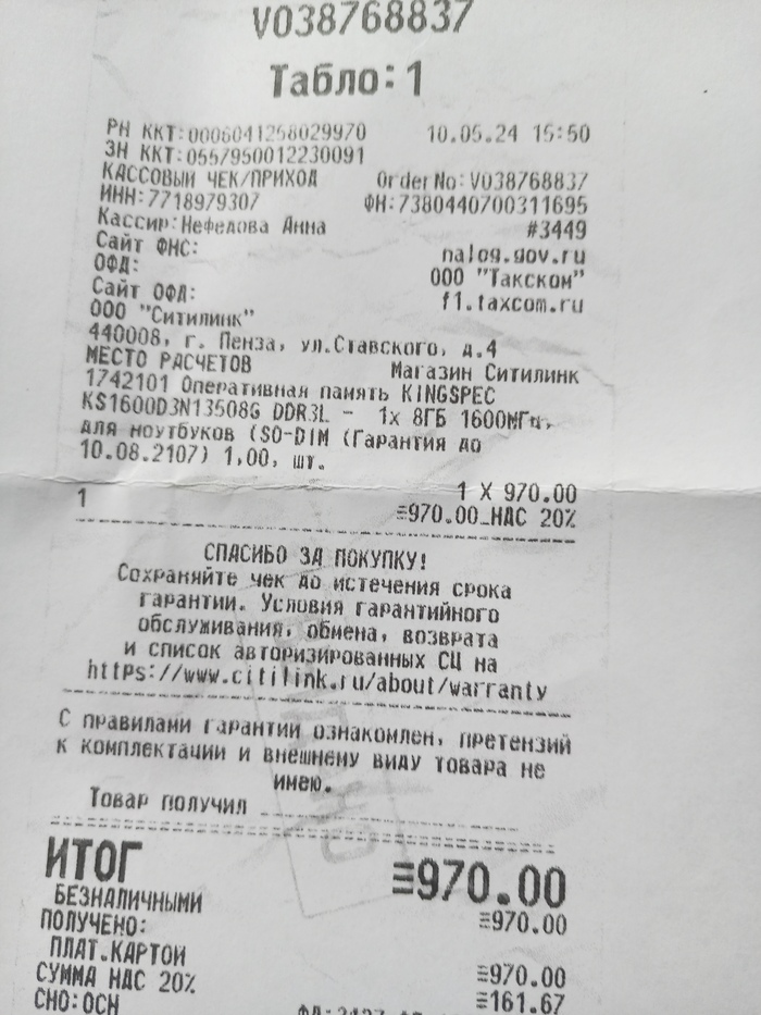 Купил сегодня на старый ноутбук оперативную память в Ситилинке. Оперативная память KINGSPEC KS1600D3N13508G DDR3L - 1x 8ГБ 1600МГц, для ноутбуков (SO-DIMM), Ret . Написано гарантия 999 месяцев.
