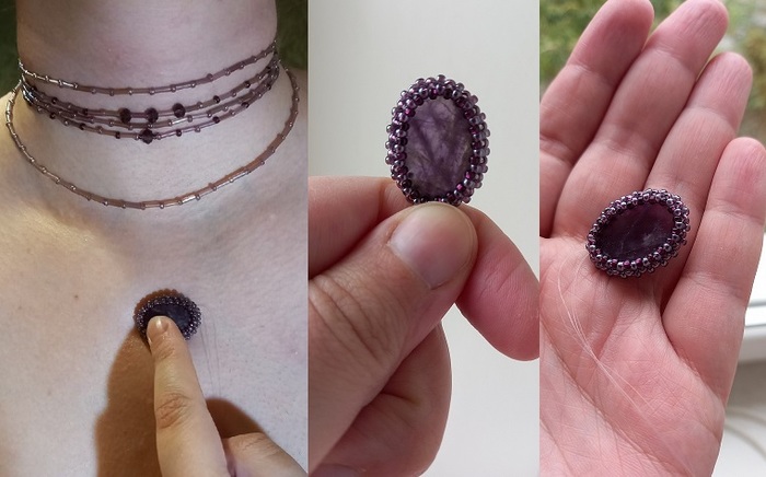 Обычно ту часть, что цепляется к шее, я делаю последней, но тут был очень особый случай - нижнюю часть надо было собирать с учётом того, как она будет крепиться к верхней. Так что первым делом я собрала застёжку и металлические коннекторы, к которым присоединила нити, обхватывающие шею. И в процессе решила, что небольшой аметистовый кабошон тут будет в тему. Потому что кабошоны всё делают лучше!