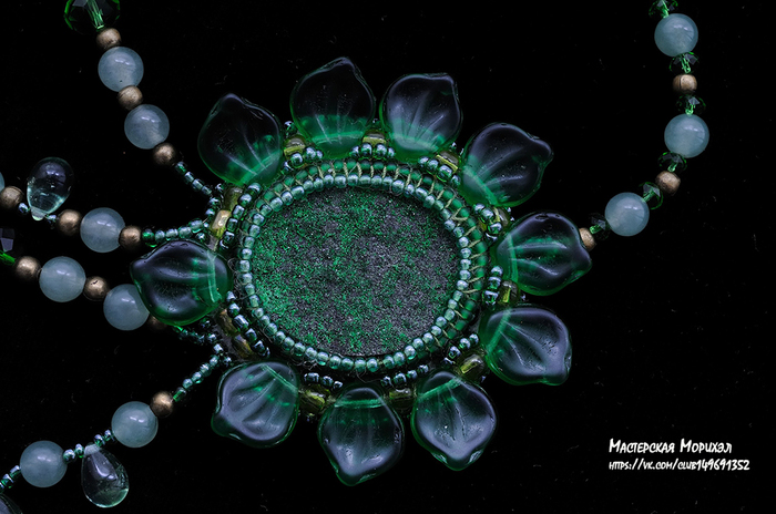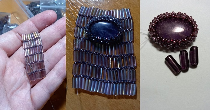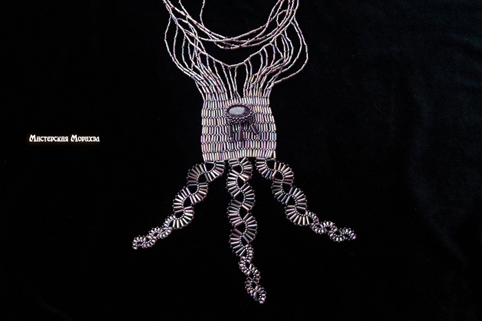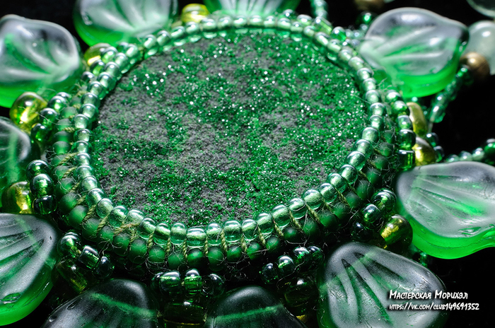 Следующая часть - центральная. Пришлось поломать голову, как применить технику бисерного ткачества к стеклярусу, но в итоге получилось неплохо. А среди моих неиссякаемых хомячьих запасов неожиданно нашлись красивые фиолетовые бусины, как раз подходящие к кабошону.