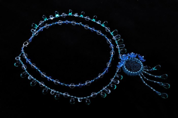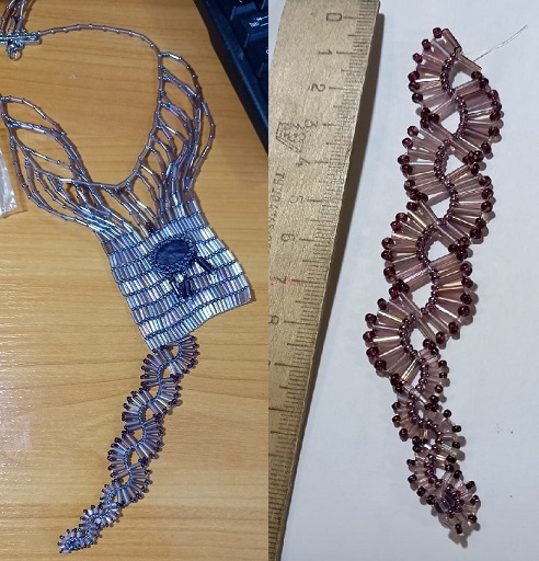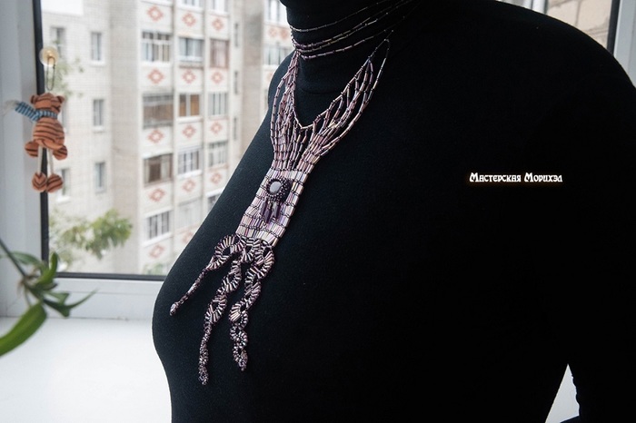 Вот соединение центральной и нашейной части было той ещё задачкой. Я даже один раз его полностью разбирала, потому что не учла разницу длины нитей и получилось криво. В итоге каждую нить приходилось дотошнейше вымерять, а то и откусывать от стеклярусин кусочки, иначе они начинали топорщиться вкривь и вкось.
