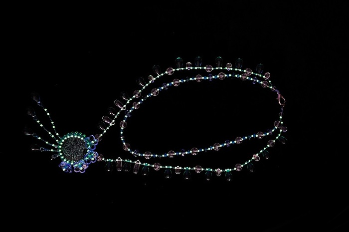 Украшение шикарное, но есть у него одна проблема: к Нейтири оно явно приклеено. Поскольку земные женщины бижутерию на грудь клеют мало и неохотно, нижнюю часть было решено переработать. Я остановилась на волнообразном плетении, оно и красивое, и чуть-чуть инопланетное :)