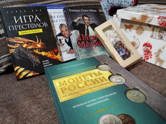 Все книги очень крутые! Все новогодние праздники буду читать)) а в маленькой коробочке справа, очень красивый шоколадный поросенок)) я даже не знаю как можно съесть такую красоту...)