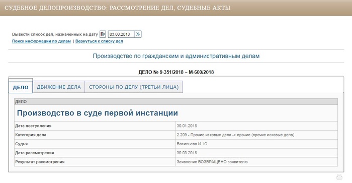 Глядя в глаза судье, юрист заявляет ходатайство об отложении заседания в целях уточнения иска, на что судья Дарковский (фамилия изменена) диким воплем вещает: "это третье заседание и в каждом новый юрист! И каждый неподготовлен! Вы взяли с человека 60 тысяч за юридические услуги при цене иска в 18 тысяч! Вы в курсе что есть высший суд?! Вас господь накажет!" Заседание таки было перенесено.