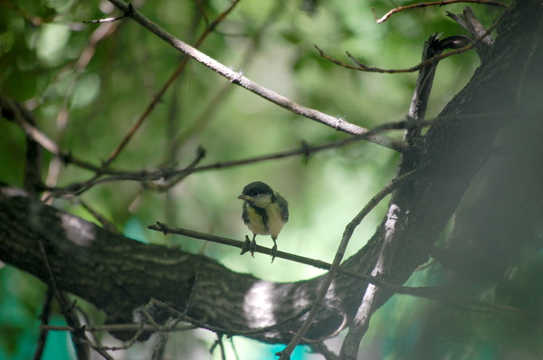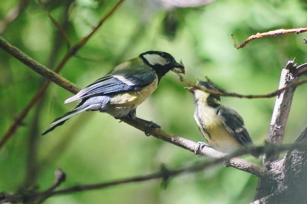 И даже там синица-родитель продолжает его кормить.