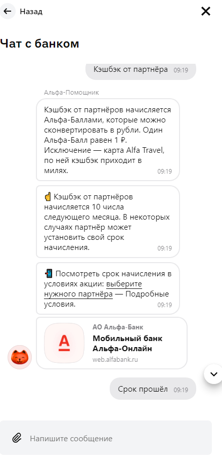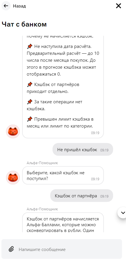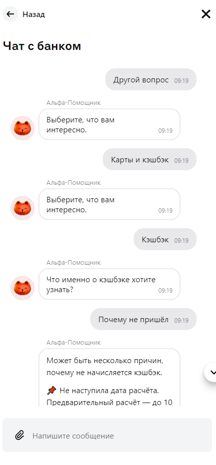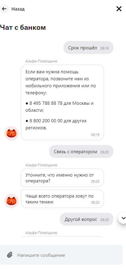 Вообще я пытался начать с чата, поскольку, как говорил ранее, не люблю телефонные разговоры. Но чат Альфа-банка это автобот посильнее телефонного. Если у кого то представление об аде это замкнутый цикл одного и того же действия то вот он филиал.