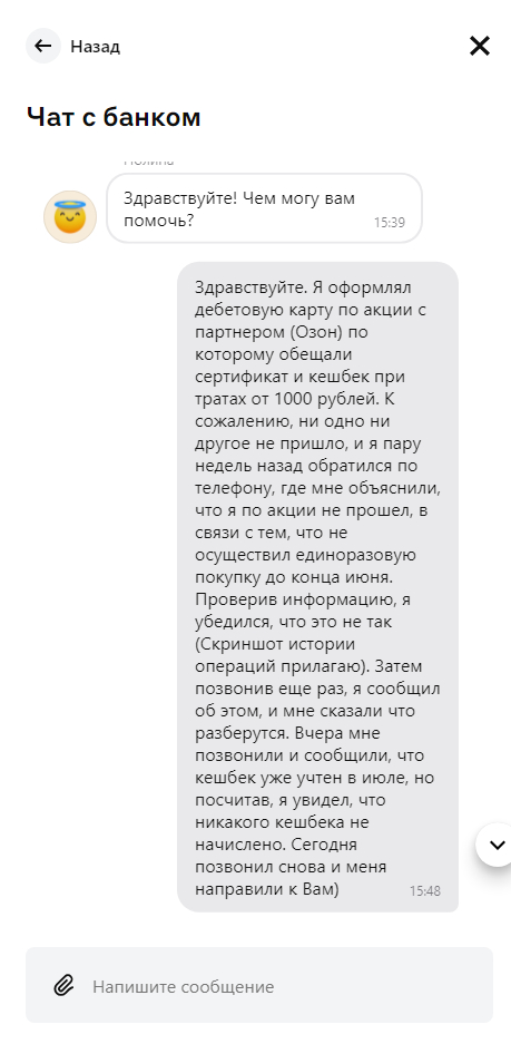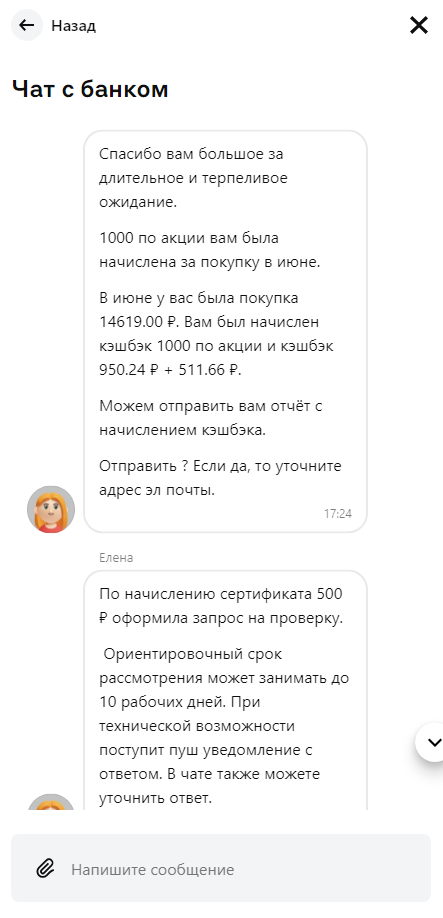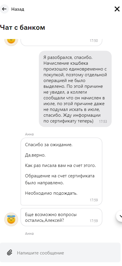 Прошло еще сколько то дней. Звонок. Я был занят, поэтому выслушав оператора буркнул спасибо и положил трубку. И вот что мне сказали вкратце: "Вам кэшбек давно пришел, а сертификат это вообще не к нам звоните в такую-то фирму и спрашивайте у них". К сожалению "организатор акции" у меня сейчас уже не сохранился, но звонить в другую фирму у меня в целом желания не было. Отношения то у меня с банком, а не с фирмой. Да и с кешбеком ситуация странная, нет нигде в истории пополнений кэшбека.