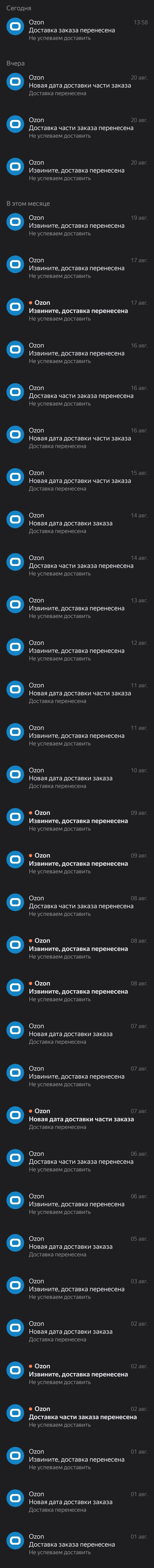 По мере надобности. И это просто кошмар, выбираю уже по фильтру "доставка завтра", чтобы забрать и применить в свои выходные. А фиг там плавал! Работаю позже закрытия пвз, планирую, что приедет, заберу с утра и буду дома это вешать/ставить/крутить, фигушки, придёт в последний вечер выходных, всё отложится из-за работы. Ремонт растягивается по времени, лето кончается. Это просто пипец какой-то. Озон не просто скатился. Не "удобный интернет маркет", а фарс какой-то.