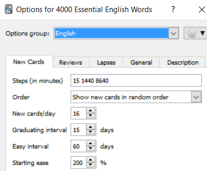 После скачки дека "4000 Essential English Words" подкрутил настройки следующим образом: