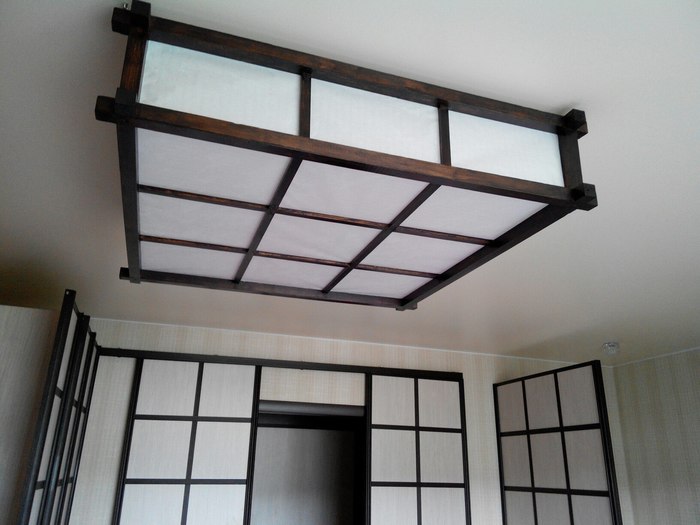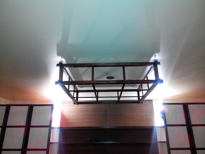 Под потолком у меня конструкция из профиля квадратной формы метр на метр где то, фото нет так как деладось до натяжки потолка по моему заказу (много лет назад)