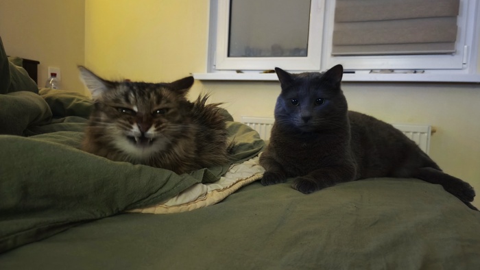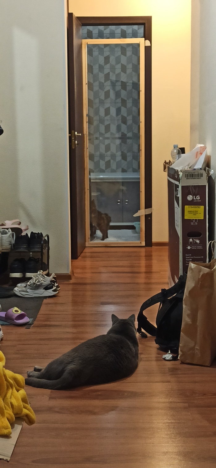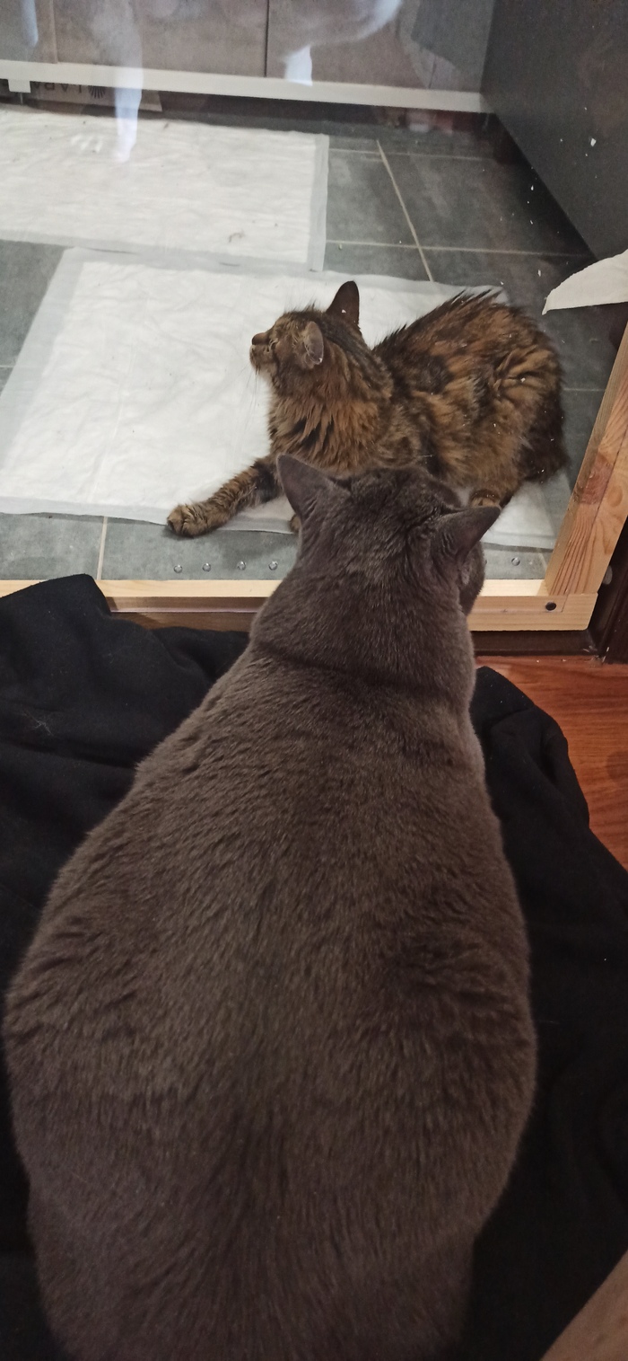 Ну... Шел пятый день, Йолке сделали в ванной барьер из досок и оргстекла, дабы коты привыкали друг к другу. Сегодня Йолку выпустили, так саказать, погулять по квартире. Сначала Тучкевич и Йолкинс шипели друг на друга, но до лапоприкладства таки не дошло. Тучкевис доводьно спокойно к ней отнесся, что меня оч сильно удивило. Пока ночует в ванной, но днем будем выпускать по чаще. Благо все идет предсказуемо и по плану) Йолка оживилась и адаптировалась. За указкой гоняется по хлеще Тучкевича)