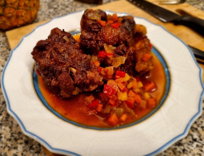 В сковородке обжарить овощи порезанные кубиками и чили. Добавить томатную пасту. Выложить овощи в кастрюлю с мясом, к тому времени оно немного уварится. При необходимости добавить немного воды. Через 20 минут попробовать на мясо на мягкость, на соль, при необходимости досолить/тушить дольше, зависит от текстуры хвоста и образа жизни скотины.