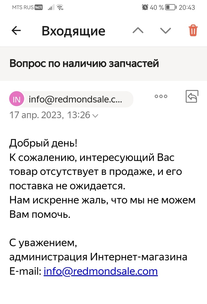 Чайник (на минуточку!) не дешёвый, 5100 рублей стоил. Обидно, практически новый ещё. Стала искать варианты решения проблемы. Нашла сайт официального представительства Redmond в России. Отправила им запрос возможно ли купить это окошко и вот что получила в ответ: