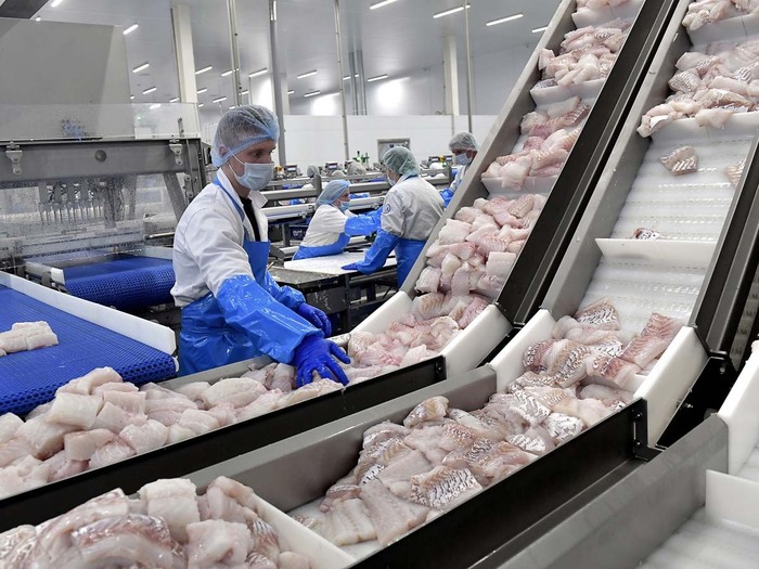 Территория предприятия около шести тысяч квадратных метров. Процесс начинается с разморозки рыбы. Затем участок автоматической разделки. Сначала треска проходит через компьютерный сканер, который, как рентген, просвечивает тушку и определяет расположение костей, затем техника рассчитывает процессии их удаления.