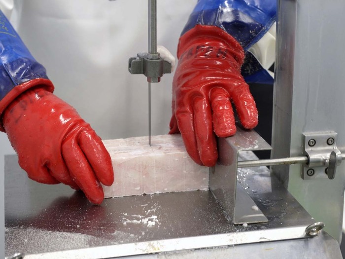 Работают в разделочном цехе в основном женщины. Линия подсвечивается снизу, чтобы было видно каждую ненужную косточку, засевшего паразита или сгустки крови. Еще один автомат пилит куски филе с помощью мощной струи воды.