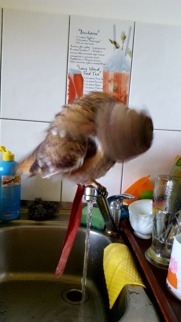 Сову нельзя насильно мыть под душем. Её НЕЛЬЗЯ после купания тискать, мять мокрое оперение, заворачивать в полотенцем. Своими действиями Вы ВРЕДИТЕ животному: