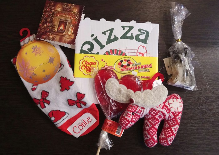 Внутри оказались новогодние носочки, чудесный лосяш, статуэтка-символ года, сладости, открытка, плёнка-пупырка и ощущение чуда (много).