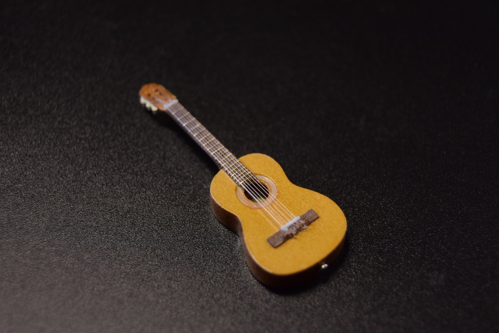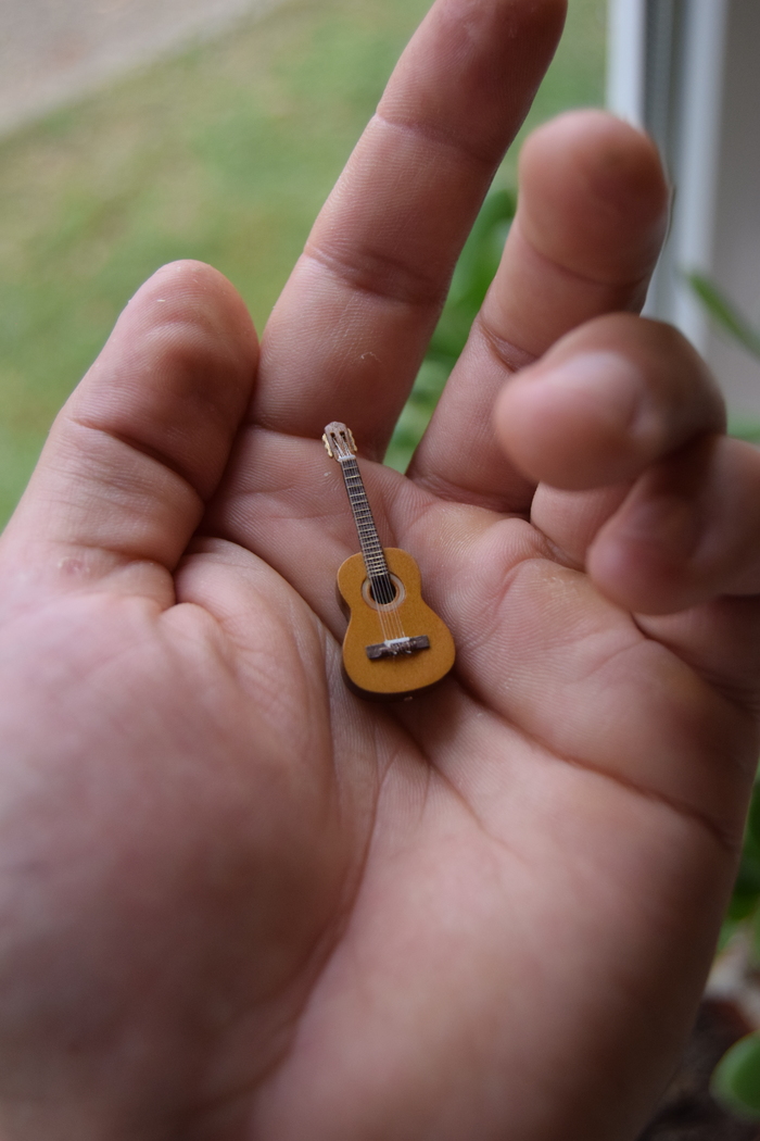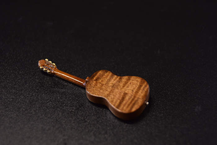 Вот такая гитара получилась в масштабе 1к24. Размер 42 мм. Корпус гитары и гриф сделан из клена. Верхняя дека подобрана из груши чтобы походить на реальный рисунок классической гитары. Резонаторное отверстие инкрустировано из натурального перламутра. Сложность заключалась в том что готовая толщина деки чуть больше полмиллиметра, а самого перламутра около 0.3мм. Так же из него выполнены верхний порожек и нижний. Лады из латунной проволоки толщиной 0.2мм. Накладка из черного ореха. Изначально он очень пористый, поэтому был специально выбран подходящий плотный участок. Покрытие шеллак.