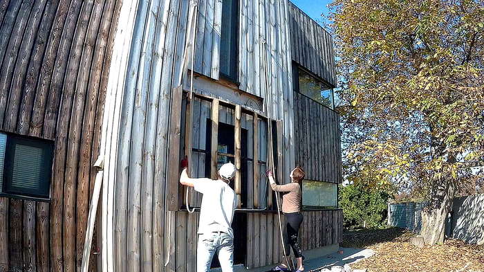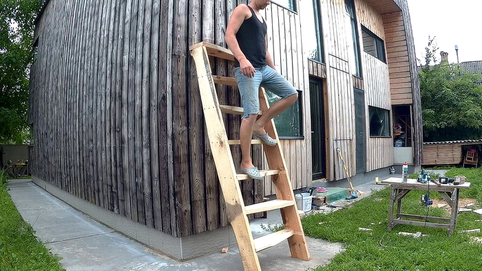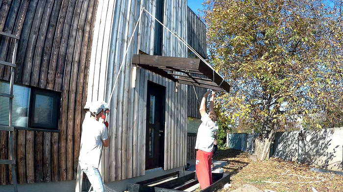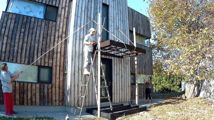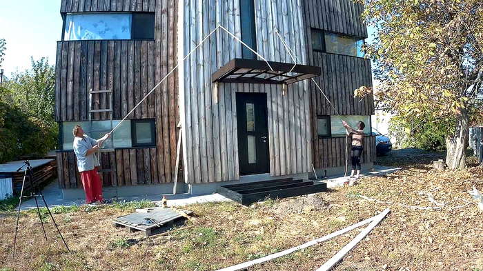 Проект разработал отец максимально простым и доступным. Дом двухэтажный, с наружными размерами 5,4*6,9 метра. Общая площадь двух этажей примерно 60 м.кв. Фундамент ленточный, стены из газоблока 300мм. толщины и трехсотой плотности. Кровля обычная двухскатная + два навеса, один для авто, второй формирует террасу возле входа в дом.