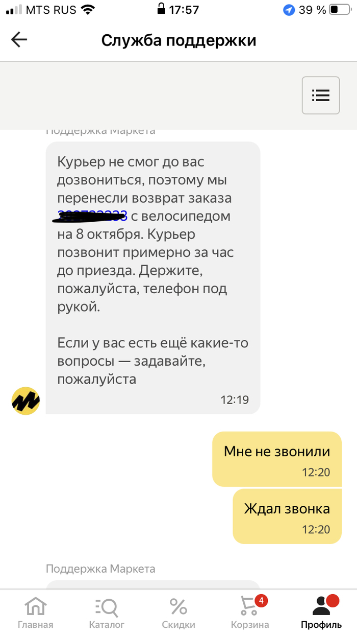 Это было мое первое обращение в поддержку, и я отменил все свои дела, ожидая приезда курьера, который так и не приехал. После этого я написал в поддержку, на что мне ответили, что курьер пытался связаться со мной, но не смог дозвониться. Я провел весь день, ожидая звонка, и знал, что это не правда. Я сказал, что звонка не было я готов предоставить детализацию звонков, но мне был дан следующий ответ.