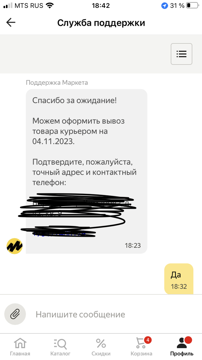 Да, вы правы. Никто не позвонил, и я провел полдня в ожидании курьера, у которого, по-видимому, были совершенно другие планы. Поддержка сообщила мне, что моя заявка находится на контроле отдела по возвратам. Это была очень неприятная ситуация, и я сначала хотел выразить свое недовольство, но узнав, что моя заявка на контроле, я решил подождать, пока Яндекс свяжется со мной. Однако прошло еще 5 дней, и Яндекс Маркет просто молчал, поэтому я решил самостоятельно написать в поддержку, чтобы обратить на себя внимание.