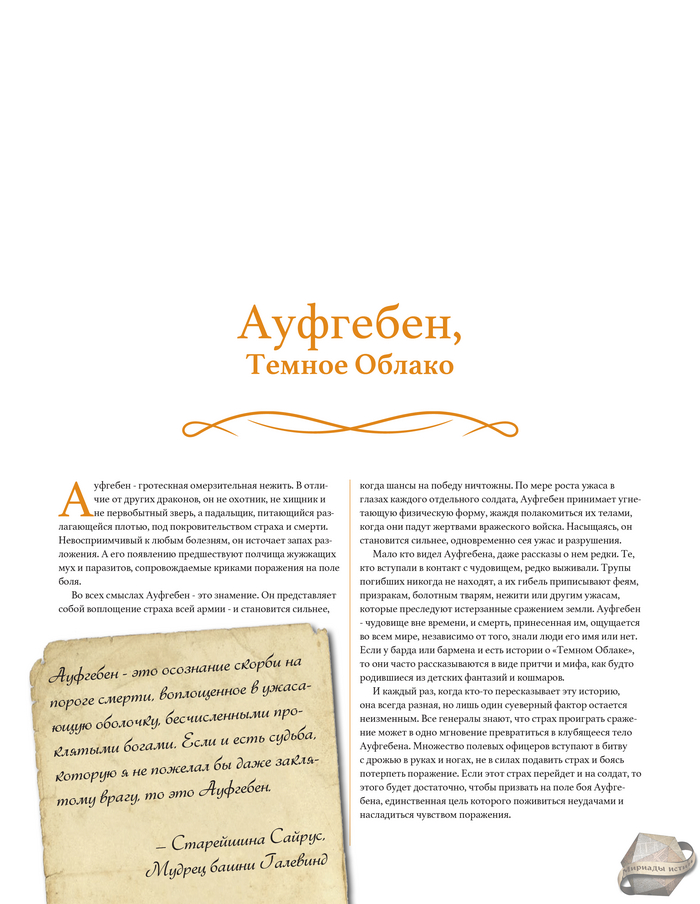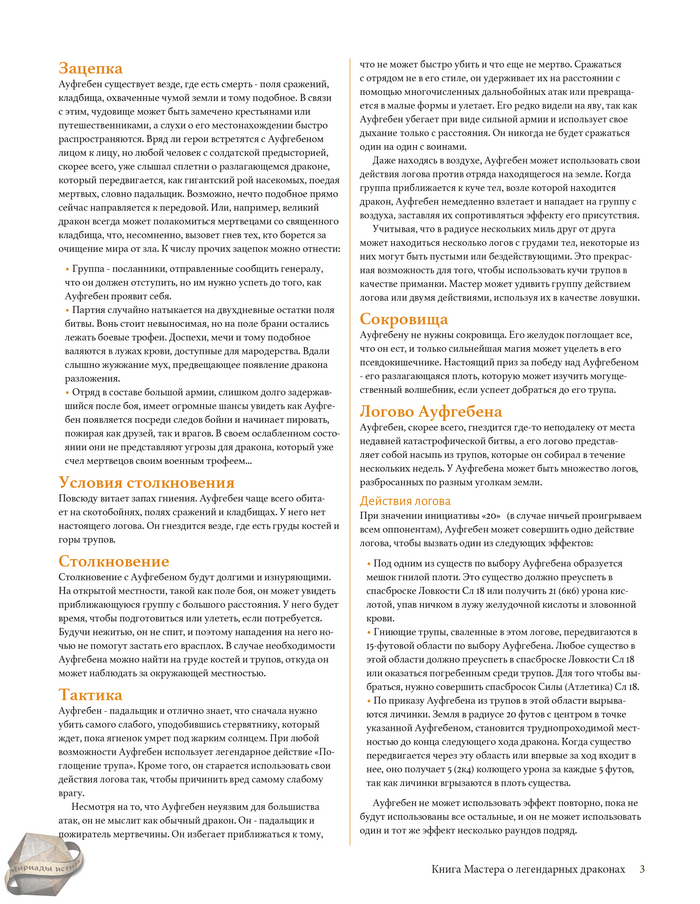 Приветствую, сегодня к вашему вниманию Ауфгебен. Это омерзительный дракон-нежить. Его тело состоит из кучи насекомых. Его можно встретить в таких местах как кладбище, поле брани, или скотобойня. Когда других драконов интересует золото, ему нужна лишь еда. Трупы и разложение - рай для вечно голодного падальщика.