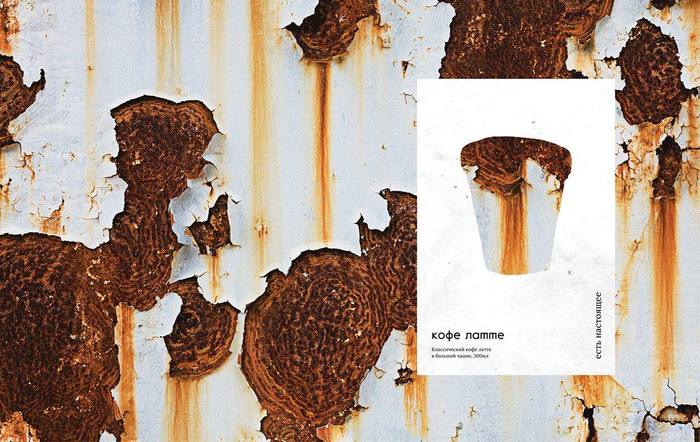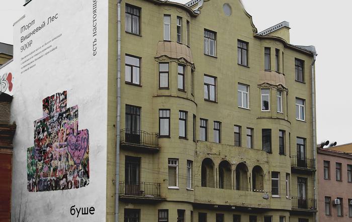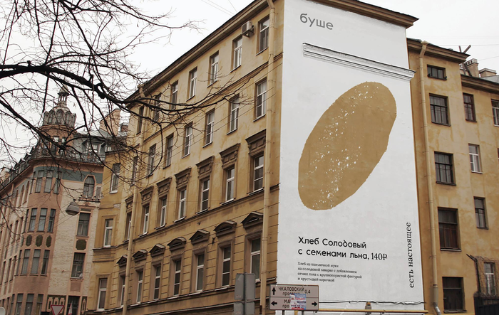 Петербургская сеть пекарен «Буше» развесила по городу плакаты, на которых схематичные изображения хлеба, тортов и кофе проявляются на потрескавшихся стенах с подтеками краски и ржавчины.