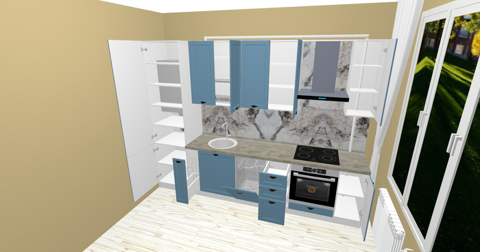 З.Ы.: тут, да и вообще при проектировании нового проекта кухни, всегда есть 100500 нюансов, я накидал "на коленке", быстро, на свой вкус и не зная ни точных размеров, ни пожеланий, ни требований, так что не судите строго ))
