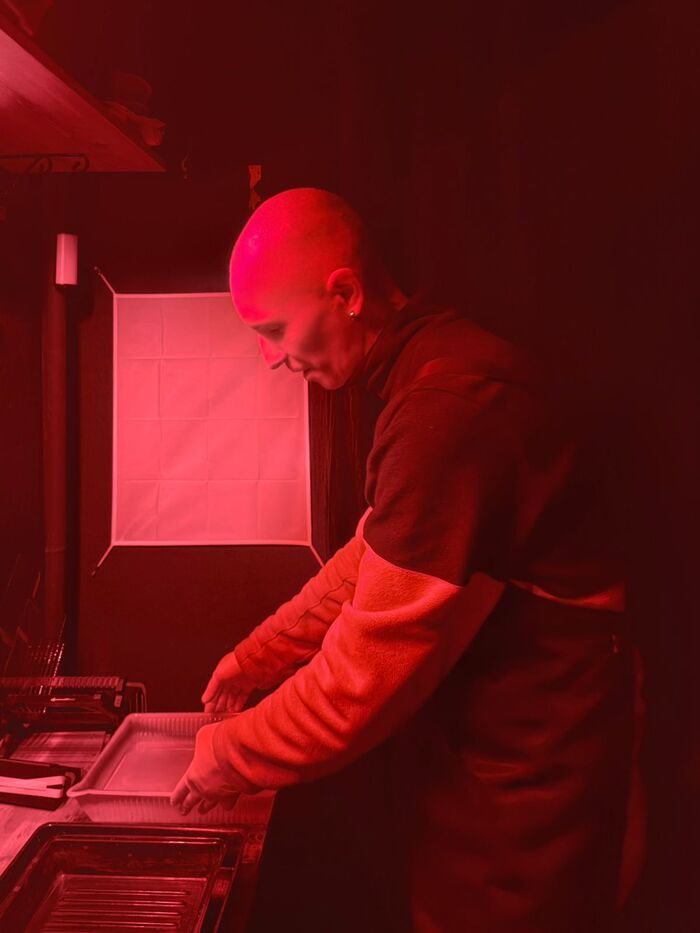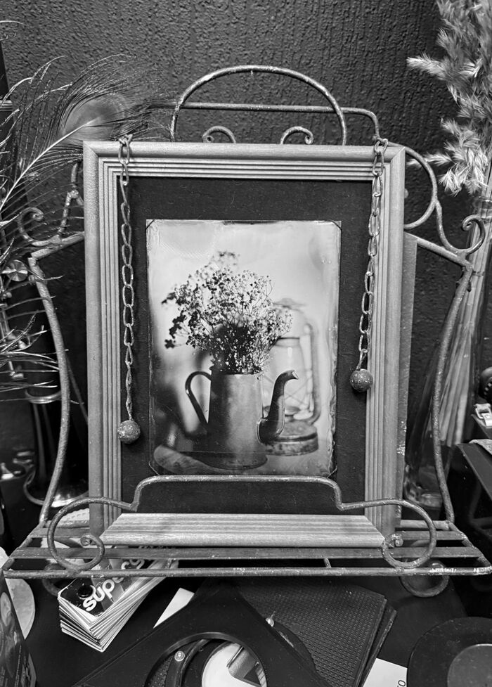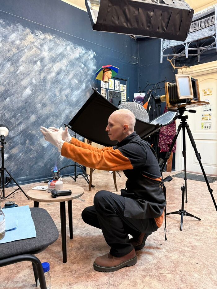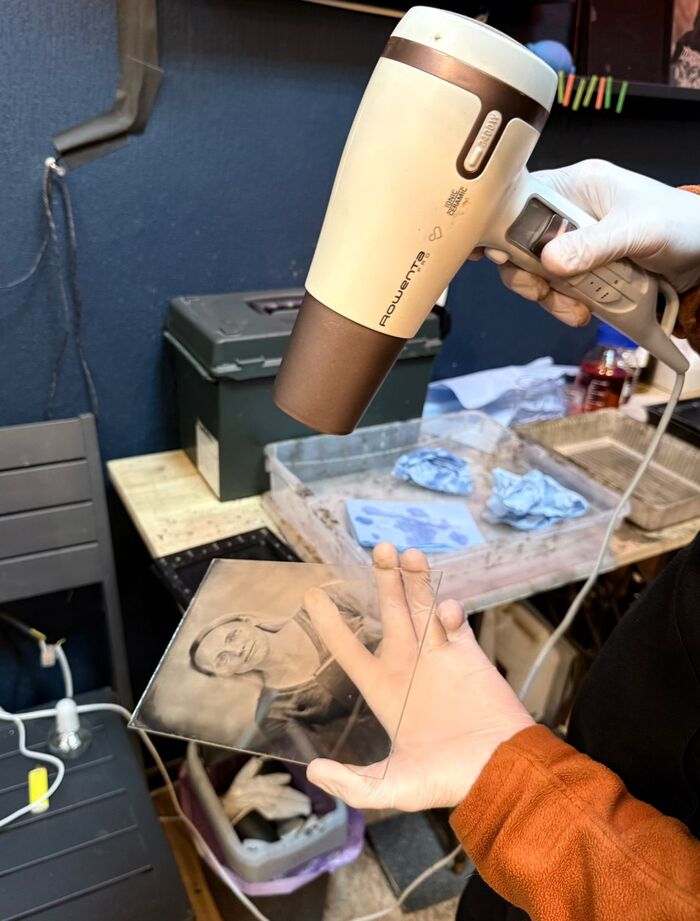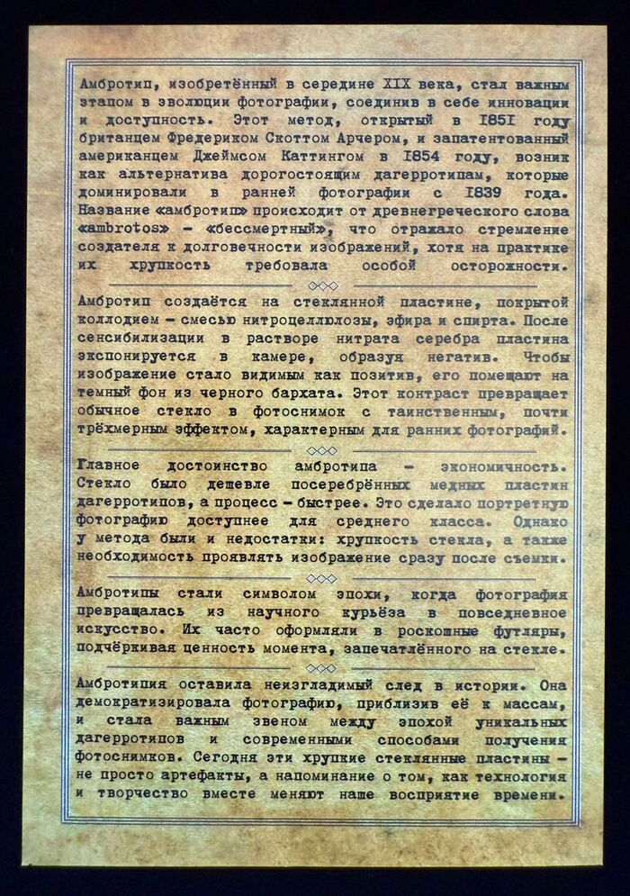 На выходных побывал в ателье Архангельска, где фотографируют по технологии позапрошлого века. Фото делают на стекло или на железную пластину, амбротип и ферротип соответственно. В технологии могу ошибиться, процесс примерно происходит таким образом: