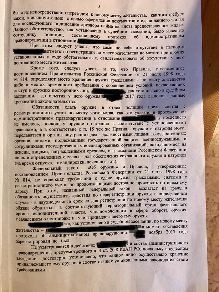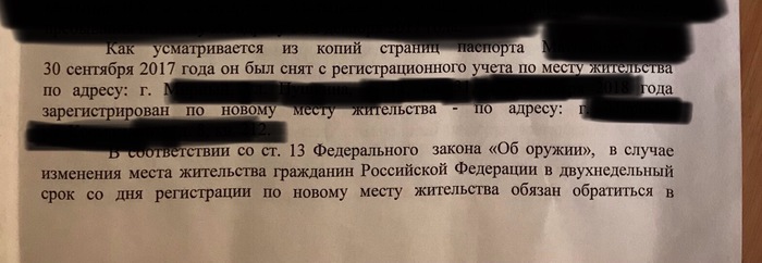 Надо было переезжать, изучив законодательство, где написано, что надо поставиться на учёт не позднее 14 дней со дня регистрации по новому месту жительства. Снялся, но из-за определенных проблем заселиться и прописаться на новом месте не мог, вот и жил пока по старому адресу. И тут впервые за три года владения ОООП на Хэллоуин нарисовывается участковый с проверкой места хранения. Ему были предъявлены документы и пистоль. Он сравнил всё, и составил акт проверки, в котором не было замечаний, в акте я поставил свою подпись. После чего у меня попросили паспорт... Мои объяснения и ссылки на законодательство на участкового не подействовали. Через несколько дней на меня оформляют протокол и изымают ствол. В протоколе пишу не согласен и статьи законодательства. Документы из суда в полицию возвращали 2 раза из-за неправильного оформления. И вот за несколько дней до истечения срока давности (если протокол об административном правонарушении не попал в суд в течении 3 месяцев, то возможно не попадёт никогда)