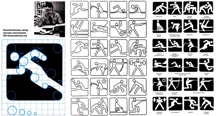 Спортивные пиктограммы разработал московский художник Николай Белков — в то время дипломник Ленинградского высшего художественно-промышленного училища им. В. И. Мухиной, разработка спортивных пиктограмм была его дипломной работой. В качестве прототипа он использовал систему пиктограмм разработанную «зубром» мирового графического дизайна Отлом Айхером для известной фирмы ЭРКО к Мюнхенской олимпиаде 1972 года. Но пиктограммы Айхера производили дробное впечатление, в них не было найдено точное соотношение знакового поля и силуэта, как следствие силуэты «плавали», производя впечатление неустойчивости и незавершенности композиции. Все эти проблемы Белков постарался разрешить в своей работе, но как оборотная сторона медали, многие его фигурки оказались «зажатыми» в графическом поле знака.