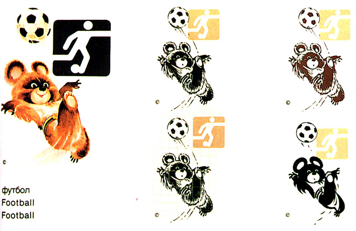 Но и Миша потребовал определенной доработки, было не ясно, как же перевести в объем нарисованное Чижиковым «каноническое» изображение. Для этой цели замечательным рисовальщиком Евгением Мигуновым была создана серия рисунков — методическое пособие для художников. Миша там изображался в различных графических техниках и вместе с человечками на пиктограммах занимался всеми видами олимпийских состязаний.