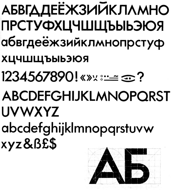 Специально для Олимпиады московским художником-графиком Анатолием Музановым было разработано кириллическое начертание этого шрифта. Благодаря использованию единого шрифта, тексты на олимпийскую тематику существенно отличались от других надписей, которых, в любом большом городе встречается бесчисленное множество.