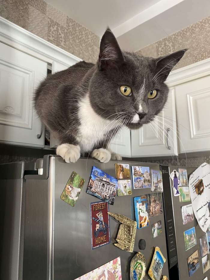 Ну и напоследок, держите Самсона, наш бывшеприютский котик. Молод, могуч и ненасытен, решил взять под контроль холодильник, чтобы мать пока болеет ничего лишнего не съела.