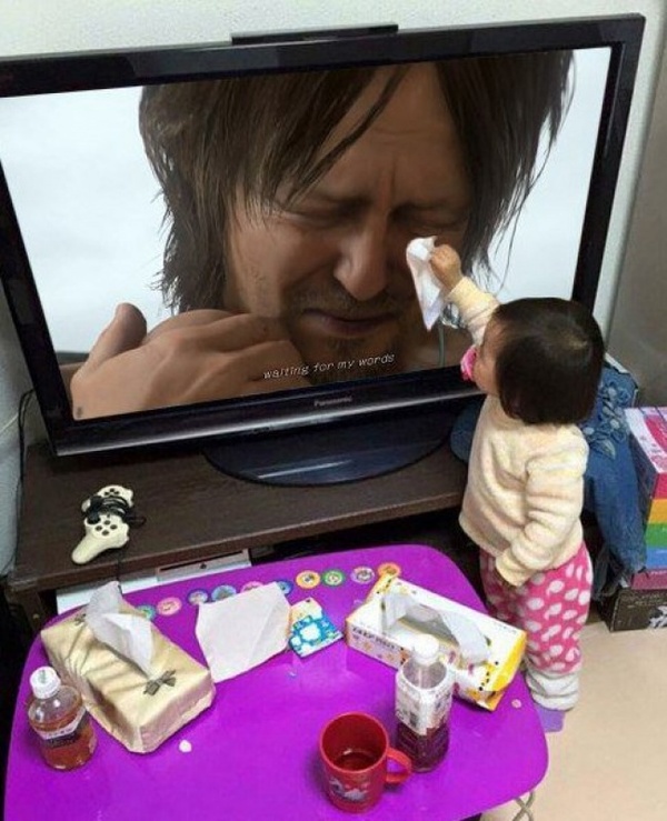 Маленькая девочка вытирает слезы мужчине с экрана телевизора